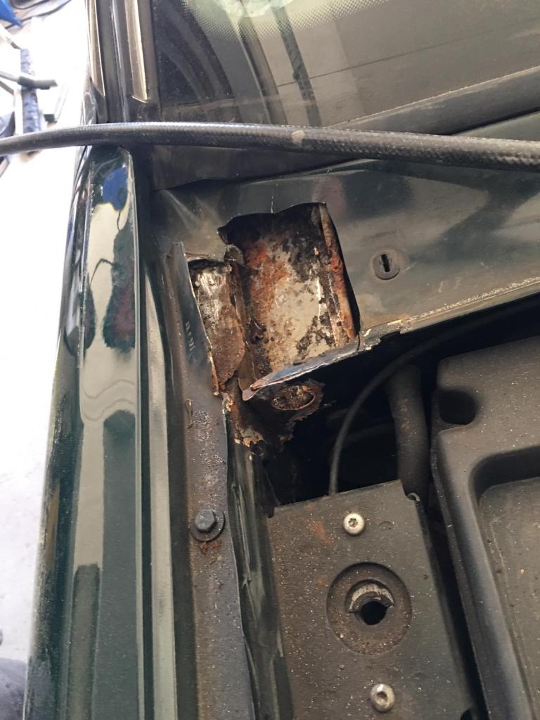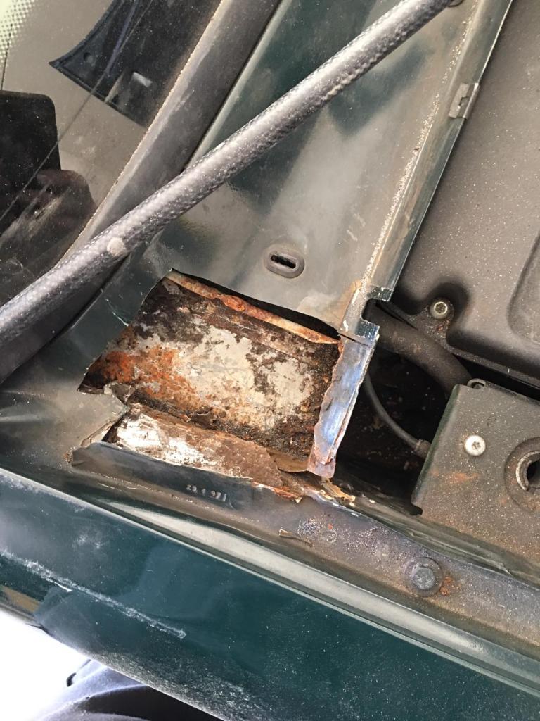 Also, wir befinden uns hier in dem Areal im Übergang zwischen Windschutzscheibe und Motorraum, oberhalb der Spritzwand, die Innenraum und Motorraum trennt. Wasser, das von der Windschutzscheibe abfließt, wird in einen Bereich zwischen den beiden gut sichtbaren Rostnestern geleitet und soll dort dann ablaufen. Wenn das nicht schnell genug geht, dann läuft das Wasser über die Falz, die die beiden Areale abtrennt und sammelt sich dort. Auf den Bildern sieht man auch gut den Ablauf, der dort dann wiederum dafür vorgesehen scheint, das Wasser auch aus diesem Bereich abzuleiten. Was man auf den Bildern nicht mehr sieht, ist das Stück Schaumstoff, das in diesen Hohlräumen lag und das Wasser gebunden hat. Die Feuchtigkeit konnte also gar nicht raus. Wahrscheinlich diente der Schaumstoff zur Dämmung von Windgeräuschen während der Fahrt.